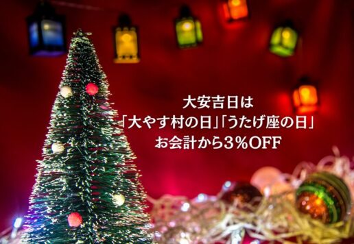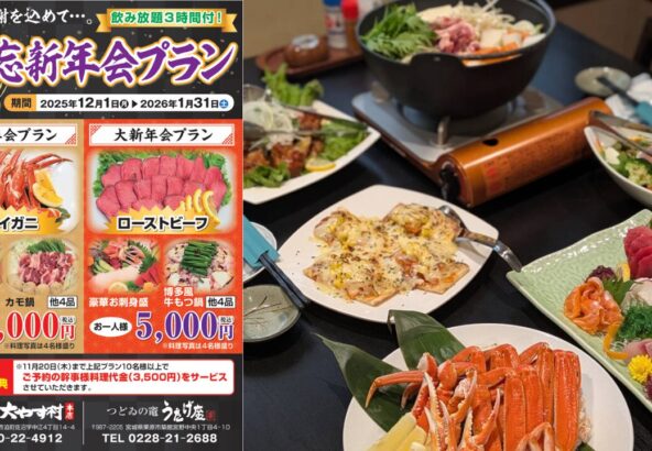 2025年の忘新年会のメニューです。 忘年会・新年会はどちらもメインとなる料理は、それぞれ固定で、残り4品は変更もございます! 飲み放題はたっぷり3時間もついておりますので、心置きなく食べて、飲んで、話せるお時間です。